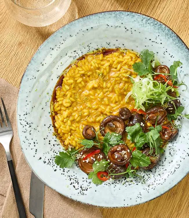 Hindistan cevizi sütlü bu risotto, karakteristik “altın süt” aromasını zerdeçal, zencefil ve tarçından alır. Shiitake mantarı ve acı biber lezzeti dengeler. Kikkoman Naturally Brewed Tamari Gluten free Soy Sauce derinlik katarken yemeğin glutensiz kalmasını sağlar.