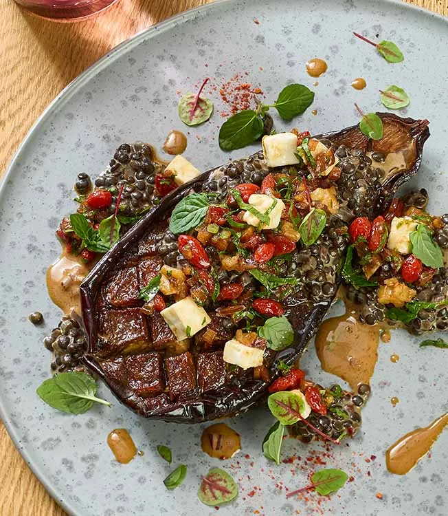 Fırında yumuşamış patlıcan, kremamsı dokulu susamlı mercimek dolgusu ile hazırlanır. Üzeri, dokusal zenginlik katan goji berry ve cevizli karışım ile tamamlanır. Kikkoman Sesame Sauce ve Kikkoman Naturally Brewed Organic Soy Sauce, bu leziz yemeği dengeler.