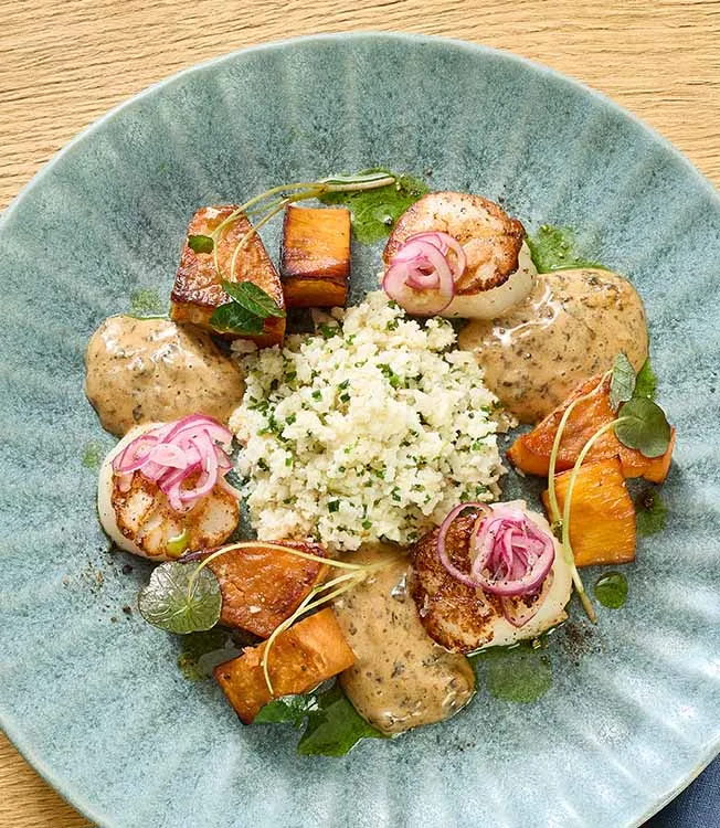 Tavada kızartılmış deniz tarağı bademli karnabahar “kuskus”, fırınlanmış tatlı patates ve nori sabayon ile servis edilir. Kikkoman Naturally Brewed Less Salt Soy Sauce ve Kikkoman Seasoning for Sushi Rice lezzeti derinleştirir ve tüm bileşenleri dengeler.