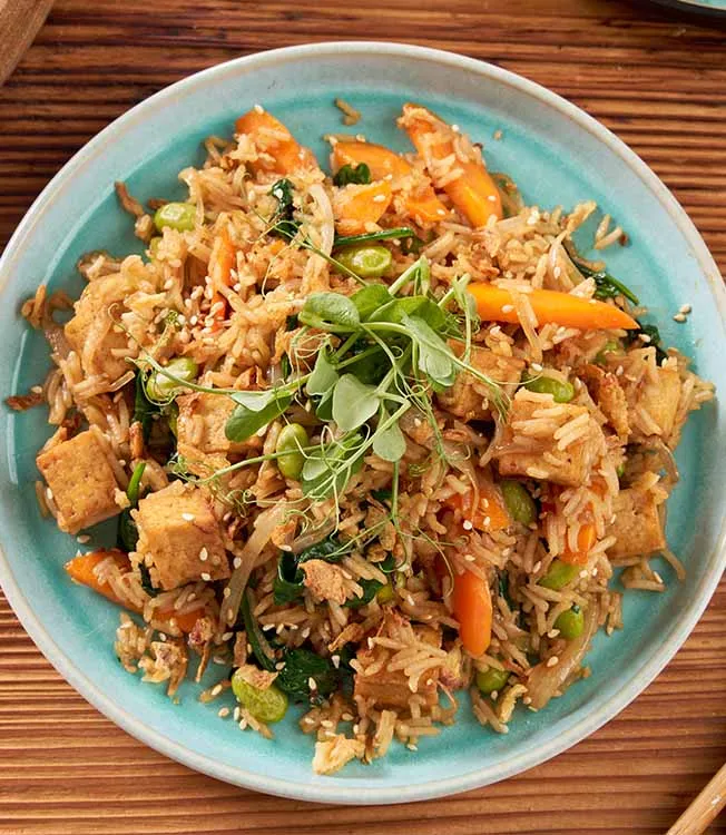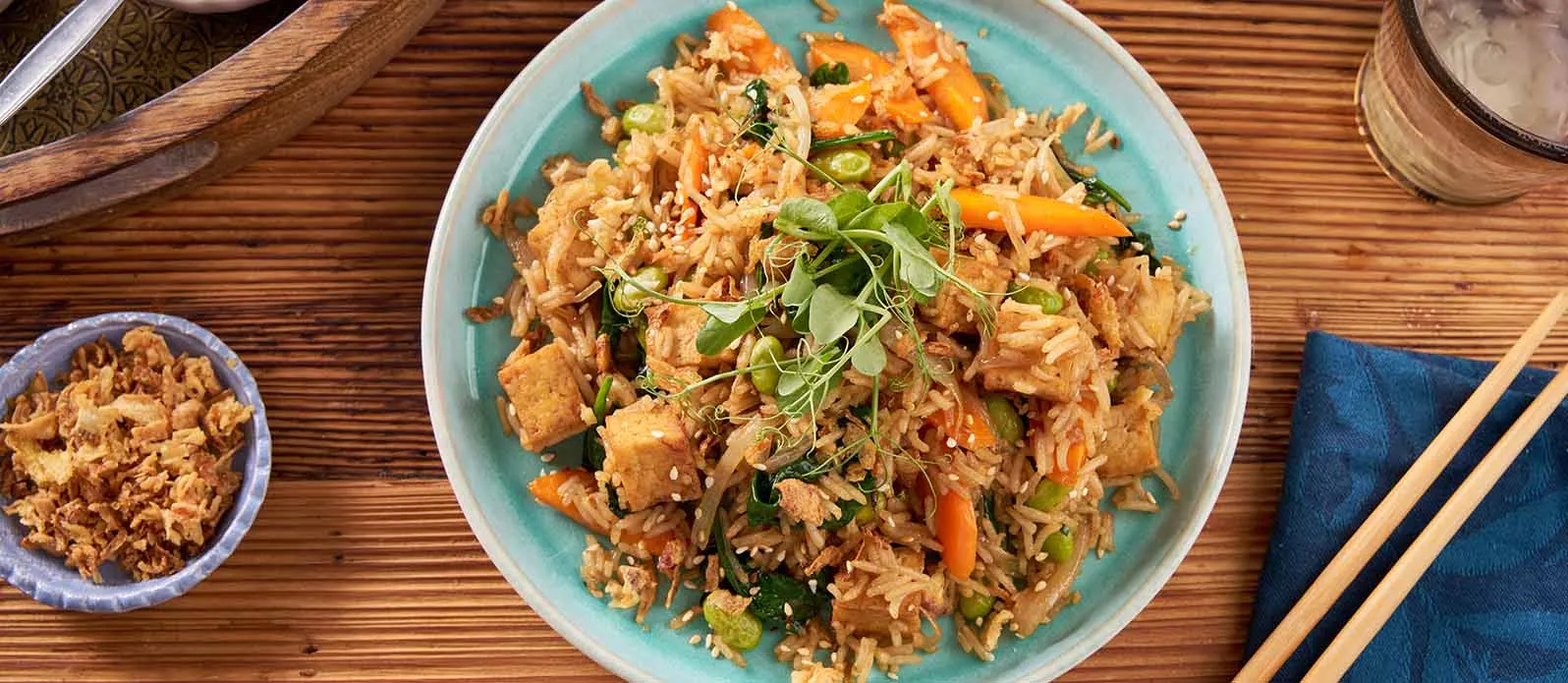 Kıtır tofu, edamame ve taze ıspanakla hazırlanan aromatik ve leziz bir yasemin pilavı. Kikkoman Teriyaki Glaze ile kaplanarak servis edilir. Hızlı, doyurucu ve Asya lezzetleriyle dolu bir tabak.