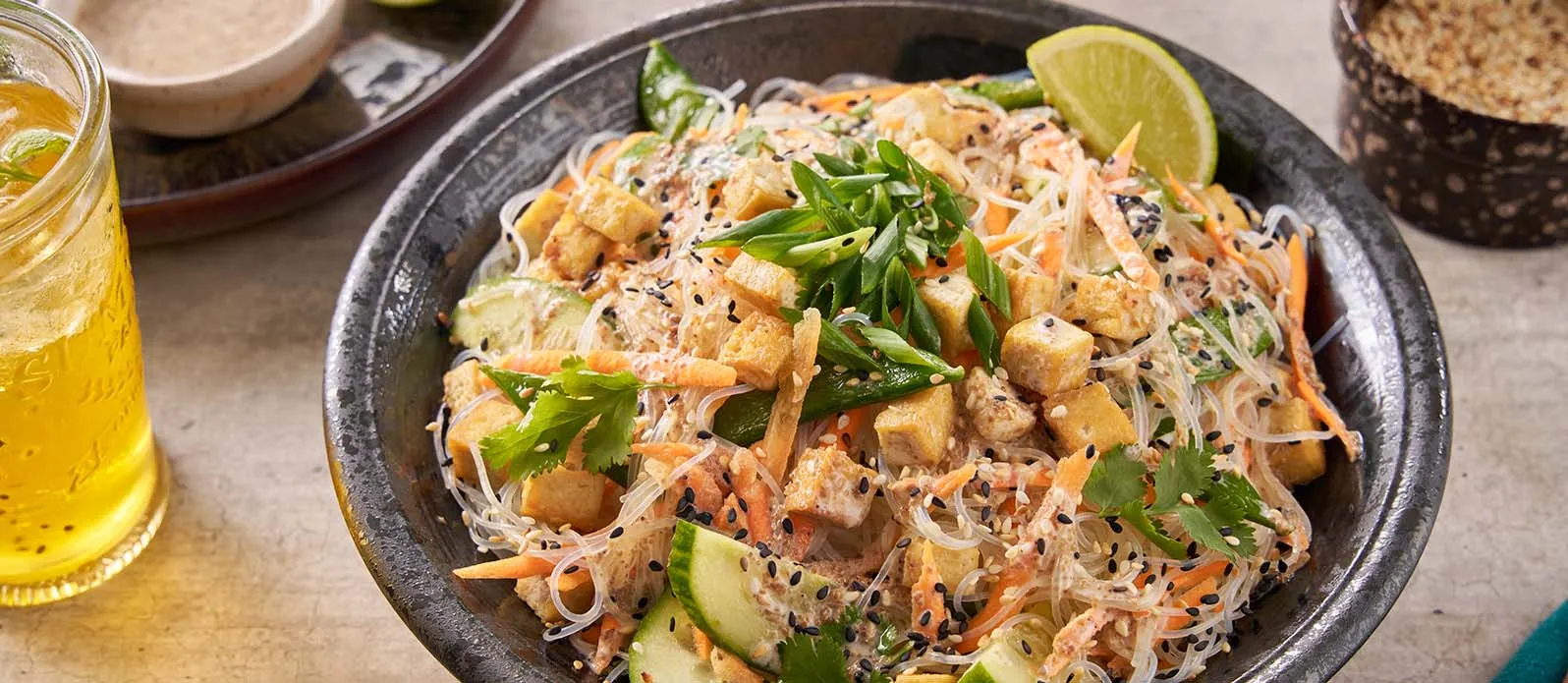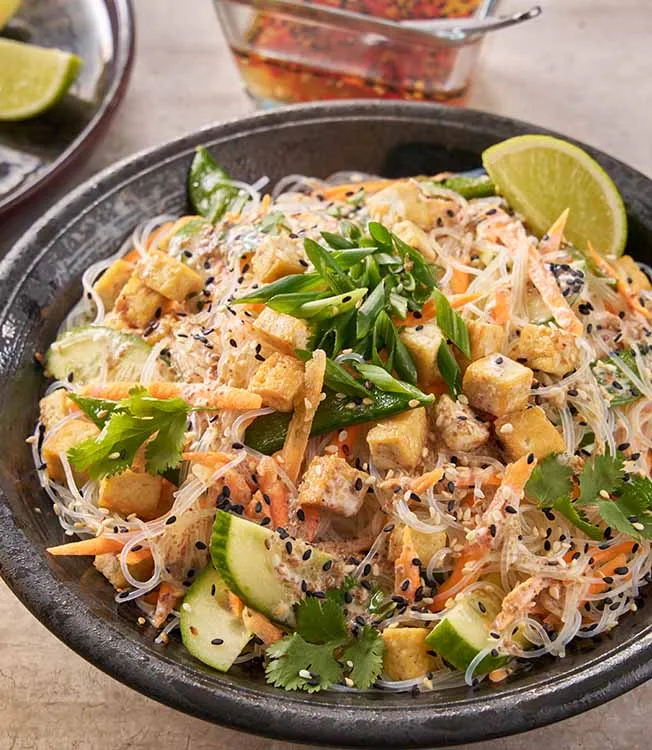 Füme tofu, çıtır sebzeler ve Kikkoman Sesame Dressing ile hazırlanan hafif ve aromatik bir pirinç noodle yemeği. Farklı dokular ve lezzet kontrastlarıyla dengeli, ferah ve modern bir tabak sunuyor.