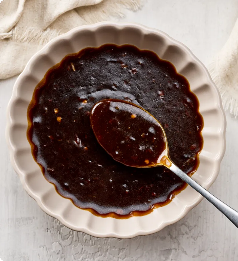 - Koyu ve tatlı glaze: Hoisin sosu