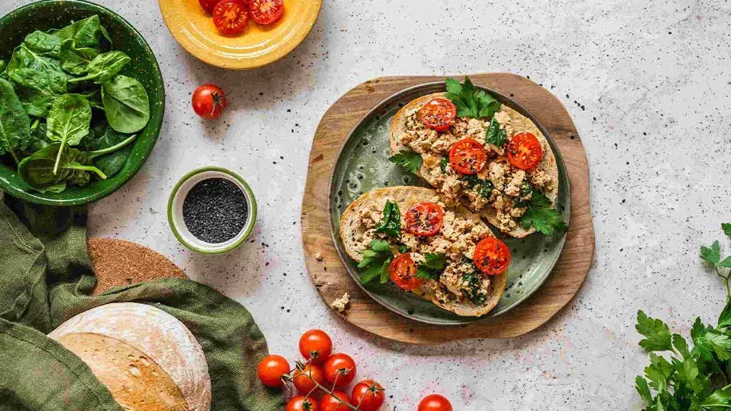 Vegan bir kahvaltı seçeneği olarak çırpılmış yumurtayı tofu ile değiştirmeye ne dersiniz? Bu çıtır çıtır, leziz tostu yemeye doyamayacaksınız: Ekmek üzerinde çırpılmış vegan tofu.
