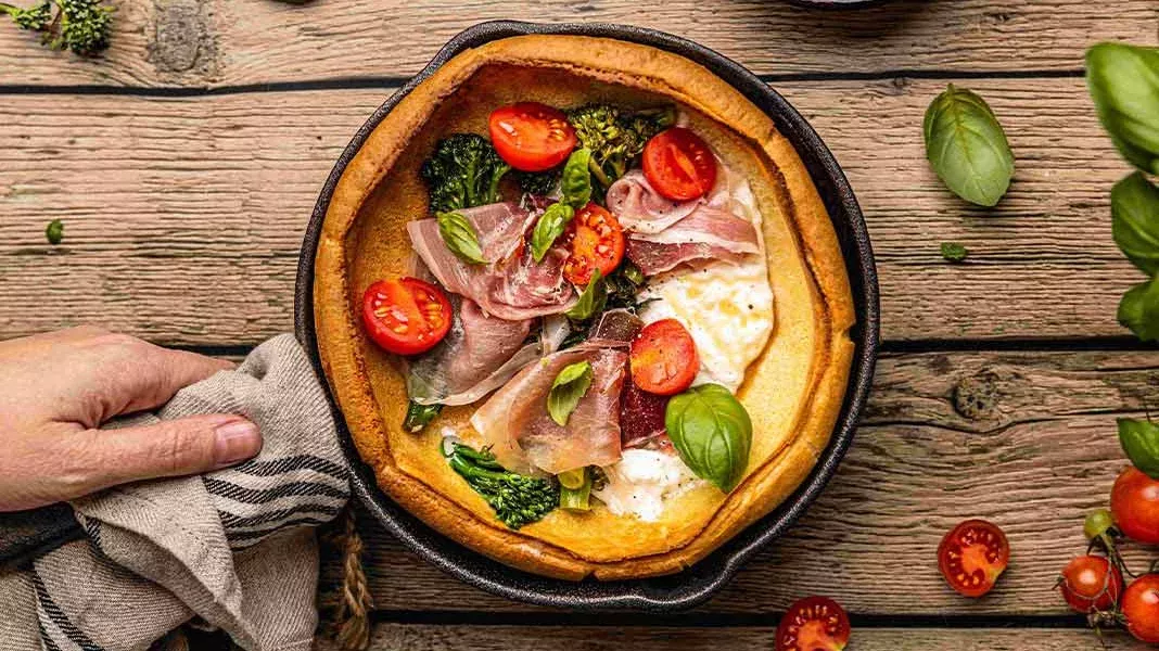 Kusursuz bir pazar brunch'ı için mozzarella ve jambonla yapılmış tuzlu pankekler: Burrata ve prosciutto peynirleri ile Dutch Baby pankekleri.