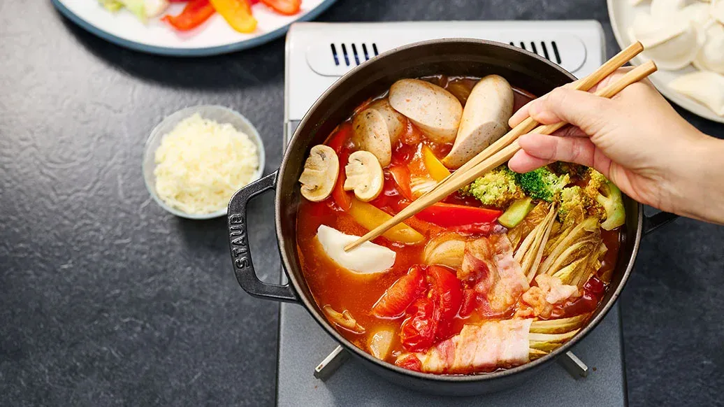 Avrupa mutfağından tanıdık malzemeleri bir araya getiren pratik bir güveç. Domatesin ekşiliği ve Kikkoman Kimchi Chili Sauce’un acısıyla lezzetlenen bu tarife, füme domuz pastırma, sosis ve erimiş peynir zengin bir umami katıyor. Hızlıca hazırlanır, paylaşmak için idealdir.