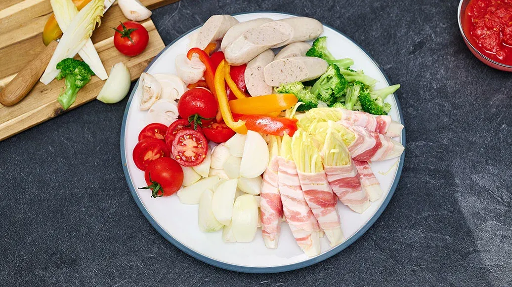Her bir hindiba parçasını bir dilim füme domuz pastırmayla sarın. Brokoliyi küçük çiçeklerine ayırın. Soğanı ince dilimleyin, domatesleri sekiz parçaya kesin. Kırmızı biberi boylamasına şeritler halinde doğrayın. Mantarları temizleyin; büyük olanları ikiye bölün, enoki mantarını demetlerine ayırın. Sosisleri ikiye kesin.