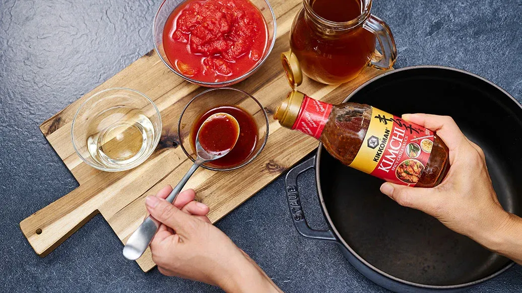 500 ml tavuk suyu – 400 gr doğranmış konserve domates – 50 ml beyaz şarap – 4 yemek kaşığı Kikkoman Kimchi Acı Biberli Sosu