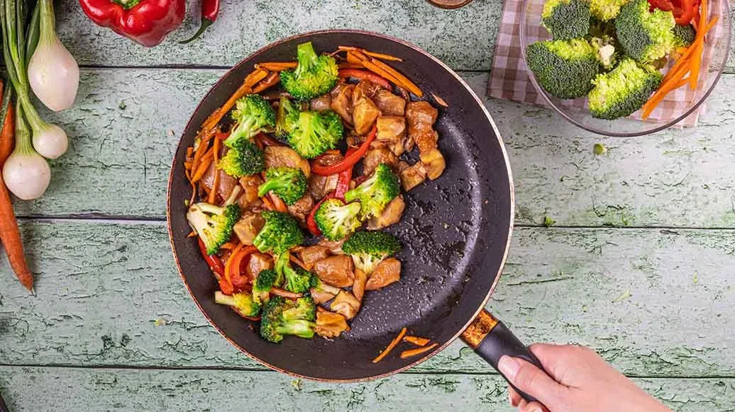 Kikkoman Soy Sauce ve balla marine edilmiş bu tavuk yemeğinde, tatlı ve tuzlu lezzeti bir arada. Sadece 30 dakikada hazır. Çıtır sebzeler ve pirinçle servis edilir. Soya sosu hem ete hem yemeğe derinlik katar.