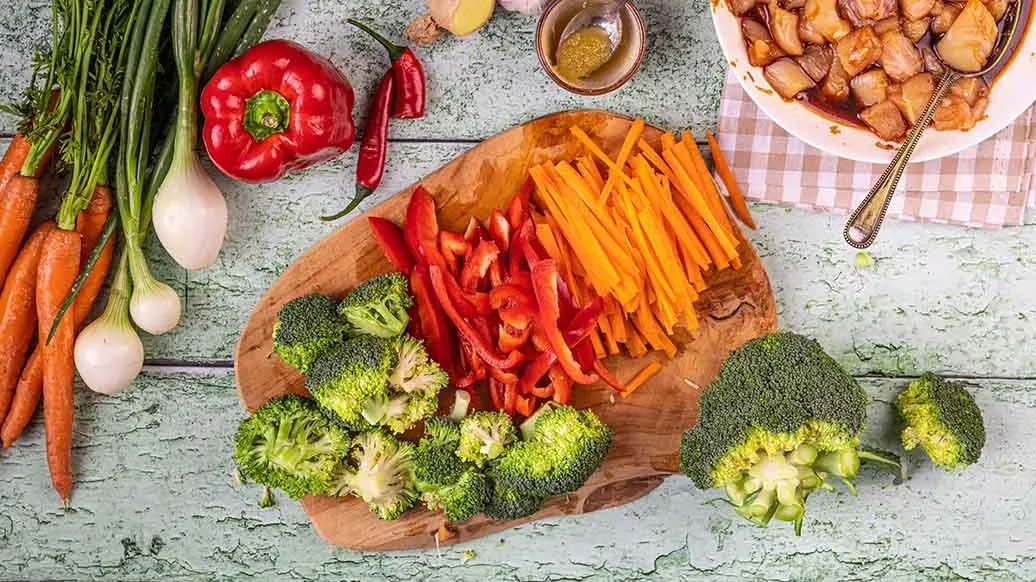 Pirinci, paketin üzerindeki talimatlara göre pişirin. Havucu çöp kibrit kalınlığında, kırmızı biberi şeritler halinde kesin ve brokoliyi çiçeklerine ayırın. Sebzeleri yağda 5 dakika sote edin.