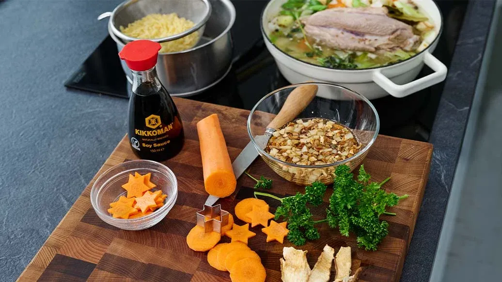 Havuç, kereviz ve pırasayla hazırlanan ve şenlik sofralarına yakışır bir et suyu çorbası. Kümes hayvanları kullanılan bu nefis çorba Kikkoman Soy Sauce ve aromatik baharatlarla zenginleştirilir. Mantar ve noodle ile servis edilir. Kış sofralarının, insanın içini ısıtan vazgeçilmezlerinden…