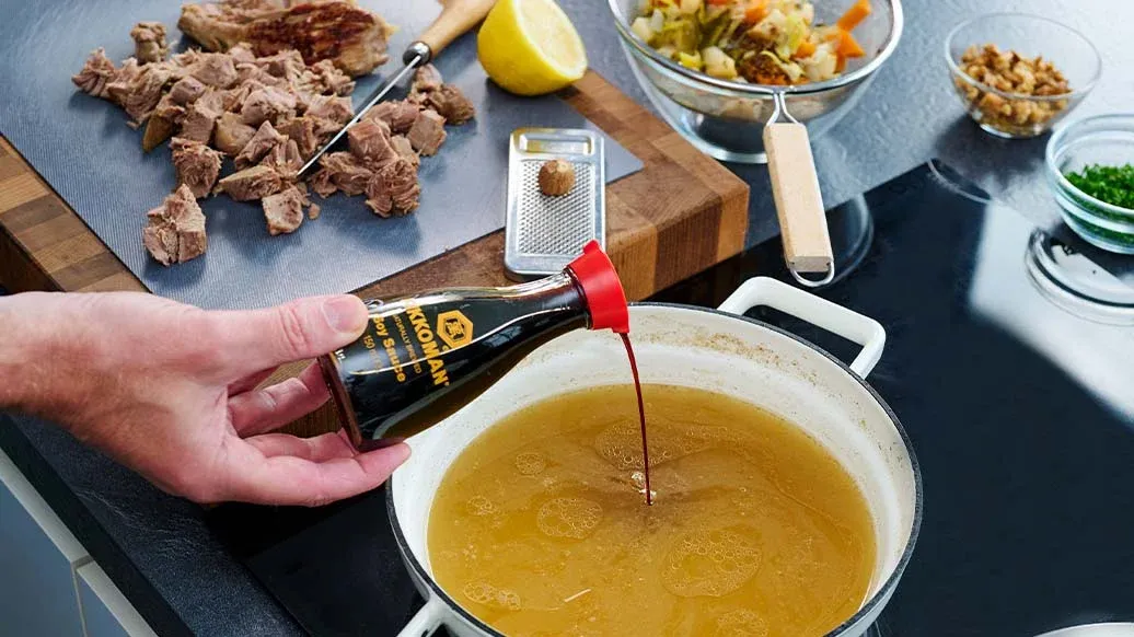 Havuç, kereviz ve soğanı küçük küpler halinde doğrayın. Pırasayı ince halkalar halinde kesin. Sebzeleri ve hindi budunu büyük bir tencereye alın, 1½ litre su ekleyin ve kaynatın. Defne yapraklarını, ardıç tohumlarını, karabiber tanelerini, yenibaharı, kimyonu, mercanköşkü ve Kikkoman Soy Sauce’u ilave edin. Kapağını kapatıp yaklaşık 1½ saat kısık ateşte pişirin.