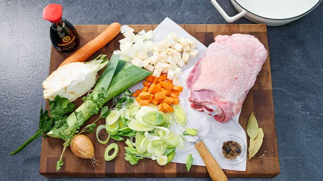 1 havuç – 1 parça kereviz – 1 küçük soğan – 1 pırasa – 1 hindi budu (yaklaşık 1,2 kg) – 2 defne yaprağı – 2 ardıç tohumu – ¼ karabiber tanesi – 4 yenibahar tanesi – ¼ tatlı kaşığı kimyon tohumu – 4 mercanköşk – 3 yemek kaşığı Kikkoman Doğal Olarak Fermente Soya Sosu