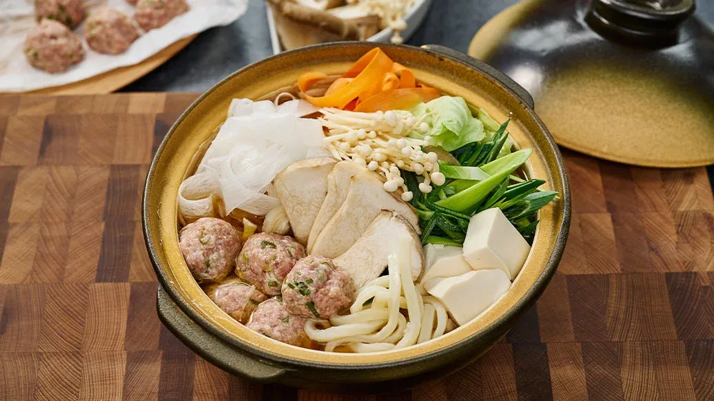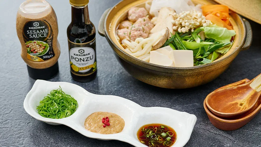 Eskiden sumo güreşçilerinin güç ve dayanıklılık kazanmak için tükettiği bu doyurucu güveç; tofu köfteleri, taze sebzeler ve noodle ile hazırlanır. Kikkoman Ramen Soup Base ve Kikkoman Sesame Oil ile tatlandırılır, yanında soslarla servis edilir.