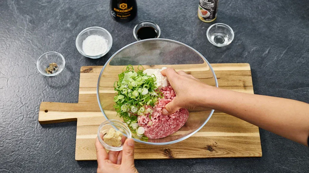 400 gr kıyma (isteğe bağlı türde) – 100 gr tofu – 1 yemek kaşığı Kikkoman Doğal Olarak Fermente Soya Sosu – 1 tatlı kaşığı Kikkoman Mirin Tarzı Tatlı Pişirme Sosu – 2 tatlı kaşığı rende zencefil – 3 adet ince doğranmış taze soğan – 2 yemek kaşığı mısır nişastası – Bir tutam karabiber