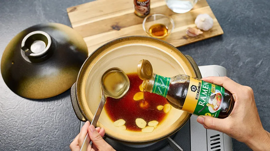 Tencereye suyu, Kikkoman Ramen Soup Base’i, Kikkoman Sesame Oil’i ve dilimlenmiş sarımsağı ekleyin.