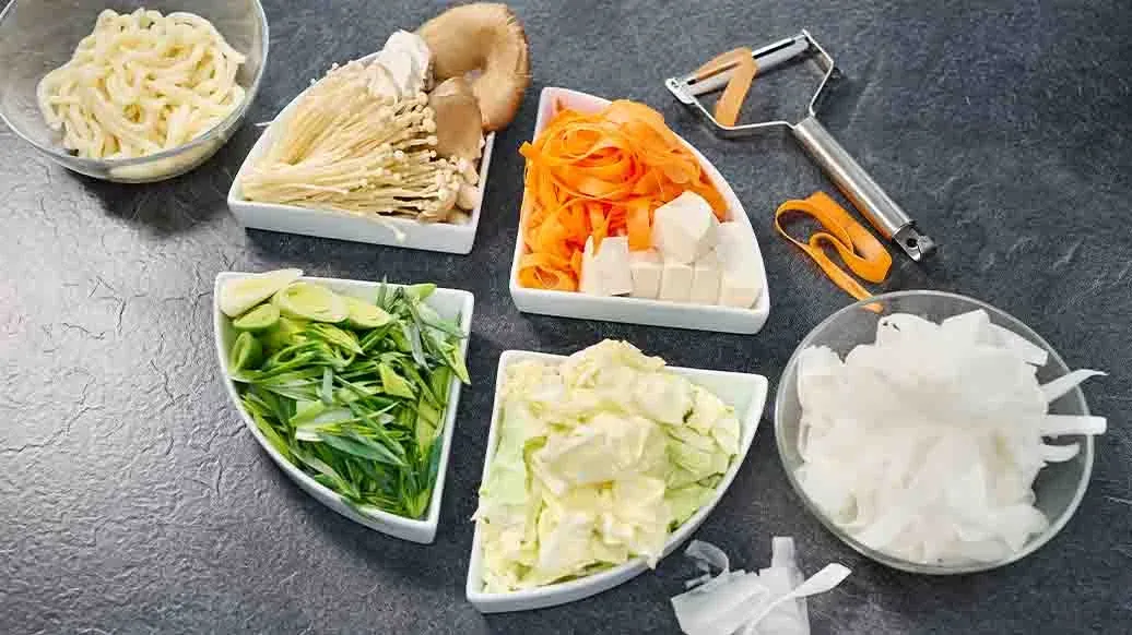400 gr Çin lahanası (yaklaşık ½ baş) – 1 adet pırasa – 200 gr daikon turpu – 150 gr havuç – 150 gr mantar (örneğin shiitake veya enoki) – 200 gr tofu