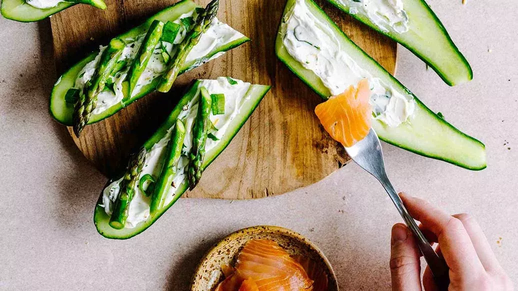 Bambaşka lezzetlere yelken açın! Peynir, kuşkonmaz ve somon füme dolgulu salatalık sandalları hafif ve ferahlatıcı bir lezzet sunarken tahinli mayonez benzersiz bir tat katıyor.