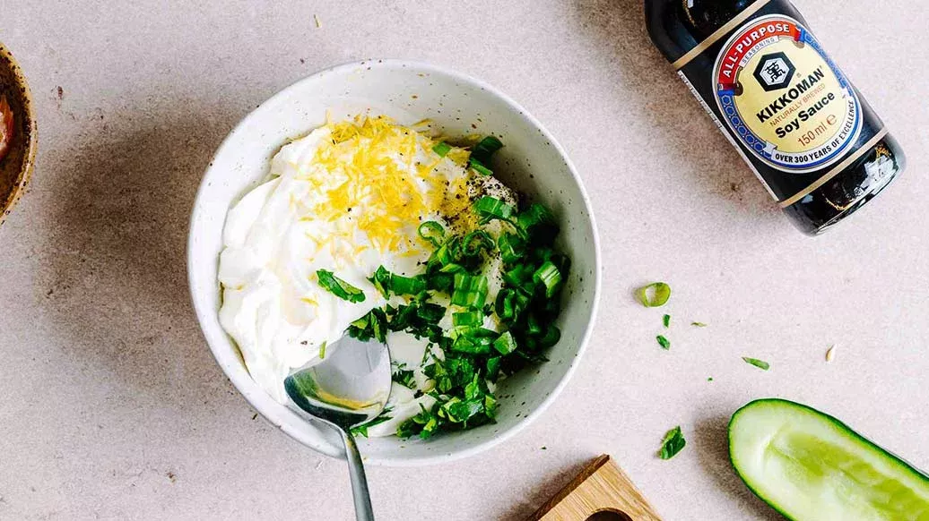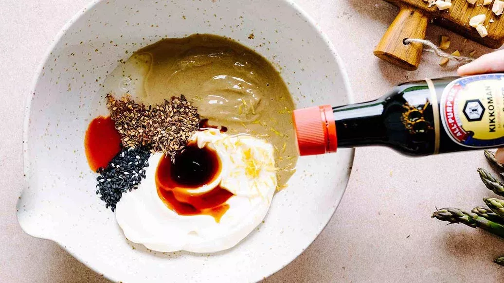 3 yemek kaşığı mayonez – 1 yemek kaşığı Kikkoman Doğal Olarak Fermente Soya Sosu – 1 yemek kaşığı tahin – 1 yemek kaşığı limon suyu – 1 tatlı kaşığı limon kabuğu rendesi – 1 tatlı kaşığı Tabasco sosu – 1 tatlı kaşığı kurutulmuş kekik – 1 tatlı kaşığı siyah susam – 1 yemek kaşığı doğranmış yer fıstığı