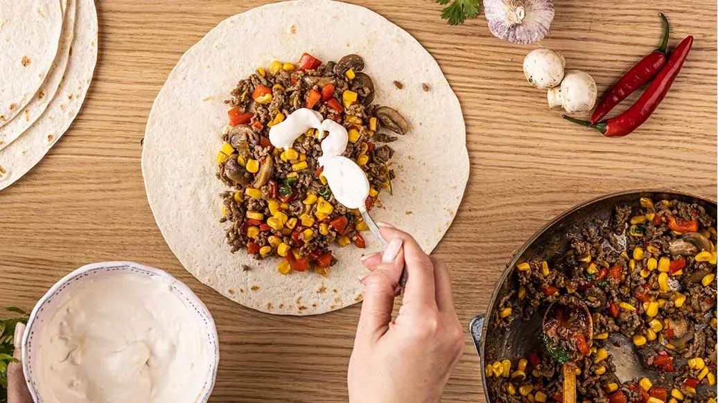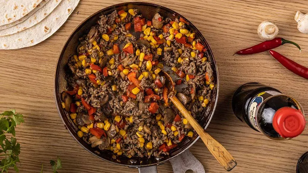 Karşınızda, dana kıymalı, mantarlı ve mısırlı leziz bir burrito. Üstelik ekşi krema ve Kikkoman Soy Sauce ile zenginleştirilmiş ve umami dokunuşu eklenmiş… Hazırlaması pratik ve bol aromalı bir seçenek.