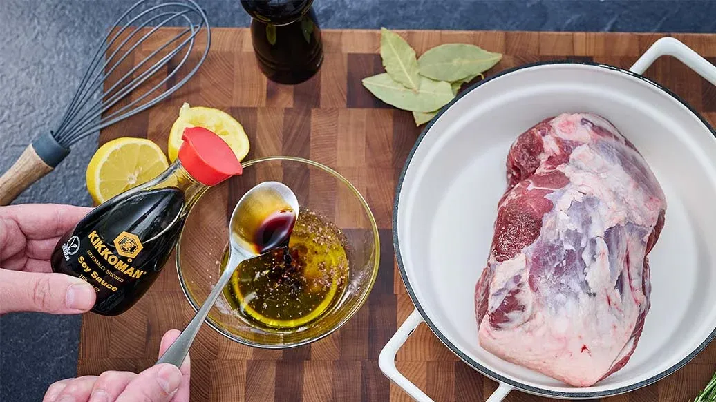 Fırını 140 °C’ye ısıtın. Kuzu budunu bir fırın kabına yerleştirin. Limonun suyunu sıkın, zeytinyağı, Kikkoman Soy Sauce, tuz ve karabiberle karıştırın. Karışımı etin üzerine dökün ve birkaç dakika masaj yaparak yedirin. Defne yaprakları ve biberiyeyi ekleyin. Eti 1½ saat kadar fırında pişirin, her 30 dakikada bir çevirin. Ardından fırın ısısını 180 °C’ye yükseltin, yaklaşık 200 ml sıcak su ekleyin, üzerini kapatın ve 1½ saat daha pişirin.
