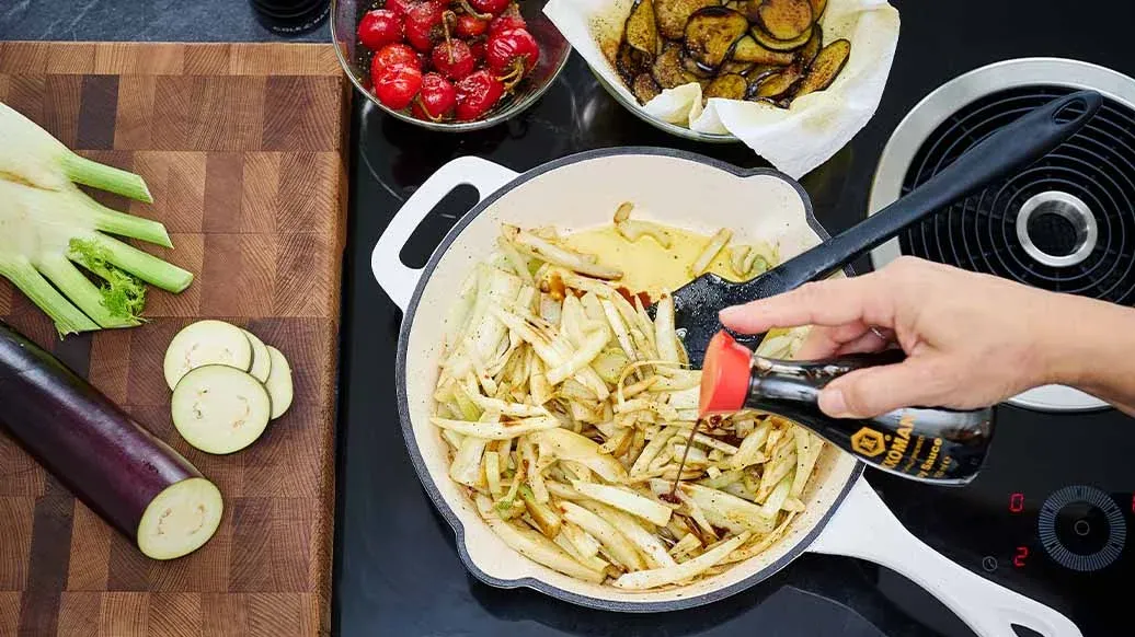 Sebzeleri yıkayın. Rezene ve patlıcanı dilimleyin, biberleri bütün bırakın. Tüm sebzeleri ayrı ayrı, kızgın yağda tavada soteleyin. Her birini Kikkoman Soy Sauce ve karabiberle tatlandırın.