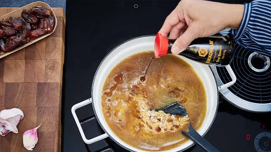 Pilav için, tereyağı ve zeytinyağını bir tencerede ısıtın. Arpa şehriyeyi ekleyip altın rengi olana kadar kavurun. Hurmaları ve sarımsağı küçük küçük doğrayın, pirinçle birlikte ekleyip kısa süre kavurun. Kuzu suyunu ve gerekirse 150 ml kadar suyu ekleyin. Kikkoman Soy Sauce’u ilave edin. Kaynadıktan sonra kısık ateşte, pirinç tüm sıvıyı çekene kadar arada karıştırarak pişirin.