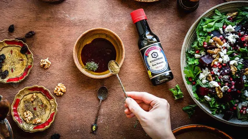 Zeytinyağı, Kikkoman Soy Sauce, agave şurubu, limon suyu, kekik ve kimyonu bir kâsede çırpın. Servisten hemen önce salatanın üzerine gezdirin.