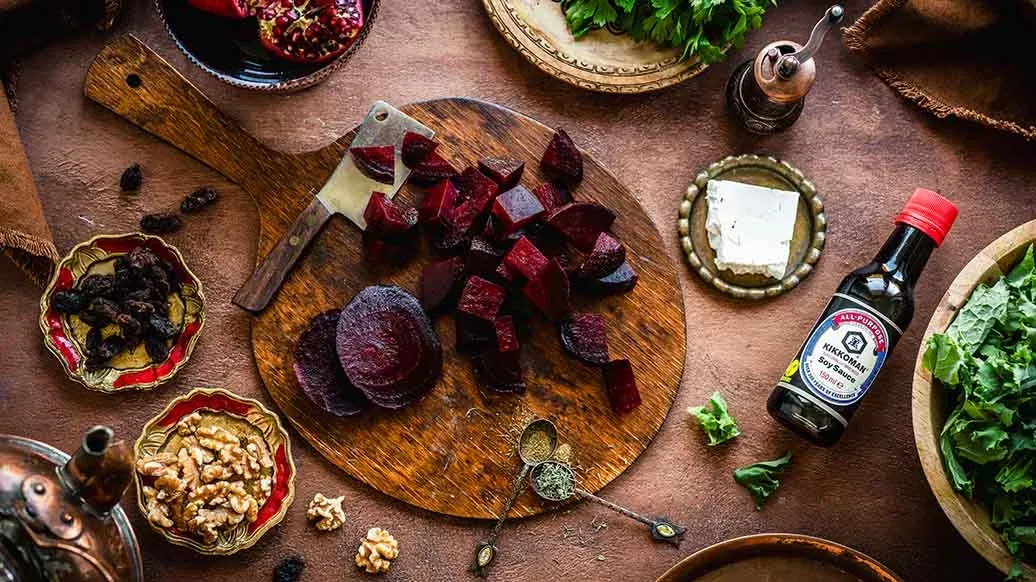 Orta Doğu esintili, renkli bir öneri: Fırınlanmış pancar, kara lahana, tatlı kuru üzüm ve nar taneleriyle dolu leziz bir salat. Ceviz ve beyaz peynire ek olarak kekikli ve soya soslu enfes bir sosla taamlanıyor. Her mevsim sofranıza canlılık katıyor.