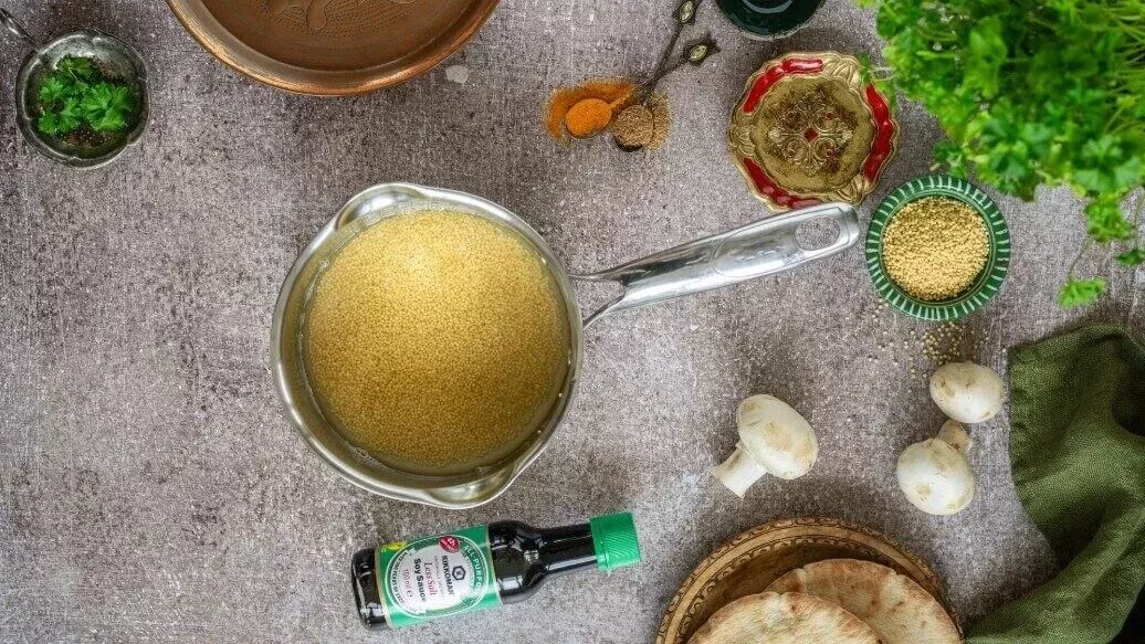 Pişmiş darıya mantarları ve soğanı, ardından otları, biberi ve Kikkoman az tuzlu soya sosunu ekleyin. Hepsini karıştırın ve küçük köfteler haline getirin, ardından yağda altın kahvesi rengine gelene kadar kızartın. Havuç sosu, doğranmış jalapeno biberi, maydanoz ve kuskus ile servis edin.