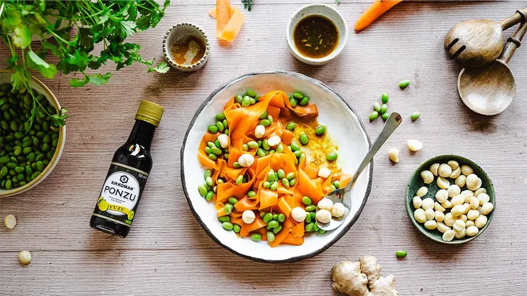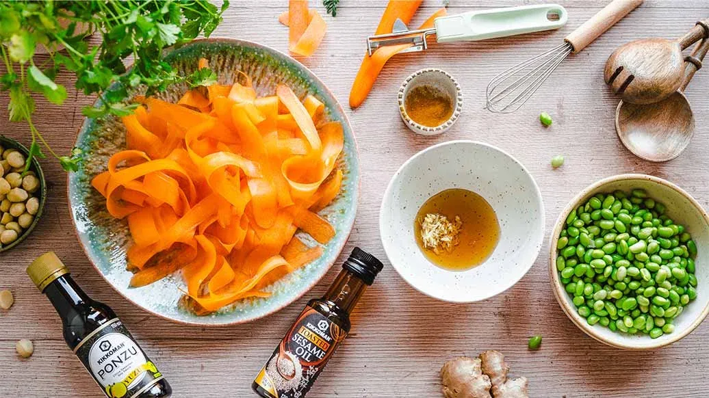 Havuçları soyun ve ince şeritler halinde rendeleyin. Kikkoman Ponzu Yuzu, Kikkoman Sesame Oil, zerdeçal ve rendelenmiş zencefille karıştırın. 10 dakika bekletin.