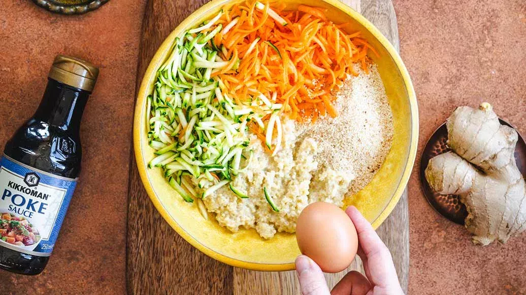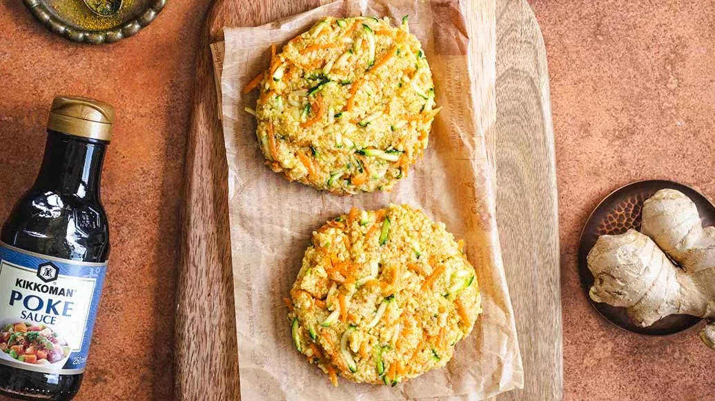 Karışımı baharatlar, zencefil ve Kikkoman Poke Sauce ile lezzetlendirin. Karışımdan iki köfte oluşturun ve iki tarafını da zeytinyağında kızartın.