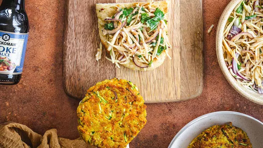 Lahanayı doğrayın, soğanı halka halka dilimleyin ve kişnişi küçük parçalara bölün. Hepsini, Kikkoman Poke Sauce, yoğurt ve köriyle karıştırın. İki naan ekmeğini de ikiye bölün. Bir yarısına hazırladığınız salatayı ve köfteyi koyun, diğer yarısıyla üzerini kapatın.