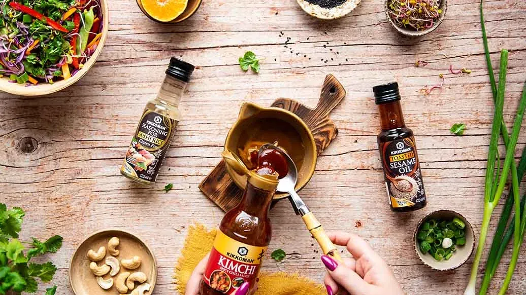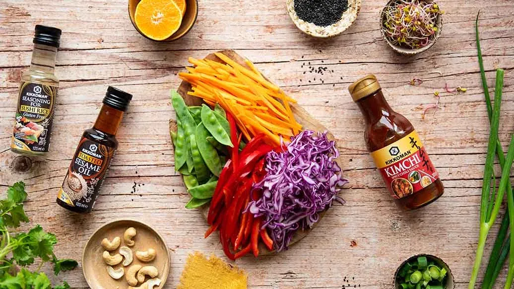 Yoğun aromalı ve rengârenk bu kırmızı lahana salatası; sebzeler, kaju fıstığı, siyah susam ve taze kişnişle hazırlanır. Kikkoman Kimchi Chili Sauce ve susam yağıyla yapılan kremamsı sosla tamamlanır.