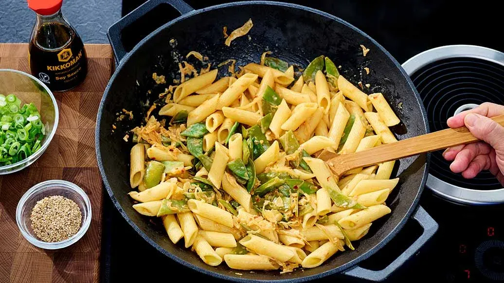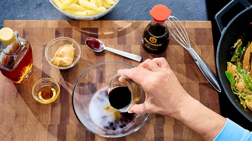 Makarnayı paketindeki talimatlara göre haşlayın, süzerken yaklaşık 100 ml haşlama suyunu ayırın. Bu suyu gochujang ezmesi, yer fıstığı ezmesi, akçaağaç şurubu ve Kikkoman Naturally Brewed Soy Sauce ile karıştırın.