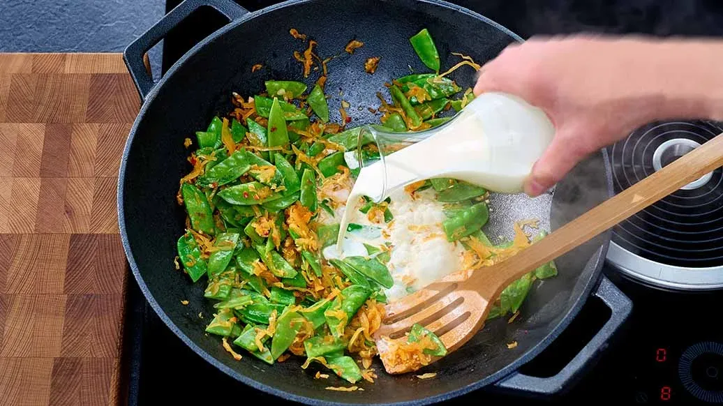 Sarımsağı ince ince doğrayın ve Kikkoman Toasted Sesame Oil ile ısıtılmış wok ya da geniş bir tavada soteleyin. Kimchi ve kar bezelyesini (gerekirse ikiye bölün) ekleyip kısa süre kavurun. Kremayı ilave edin, kaynatın ve yaklaşık 5 dakika hafifçe pişirin.
