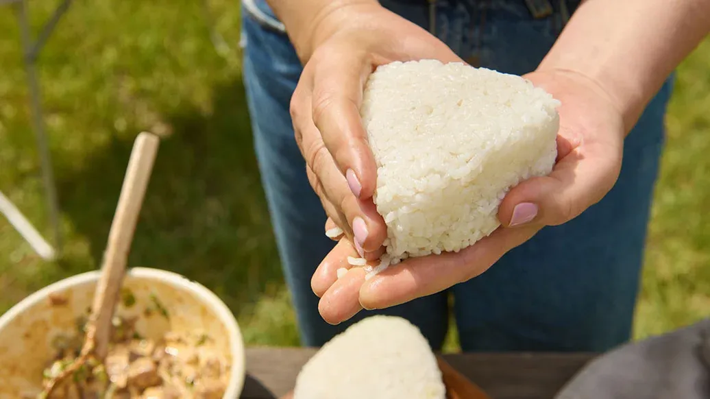 Bir avuç pirinci üçgen şeklinde şekillendirip streç filme yerleştirin. Ortasına ton balığı karışımından koyun. Üzerine biraz daha pirinç ekleyip üçgen şeklini verin. Onigiri’yi streç filme sarıp şeklini koruması için üzerine hafifçe bastırın.