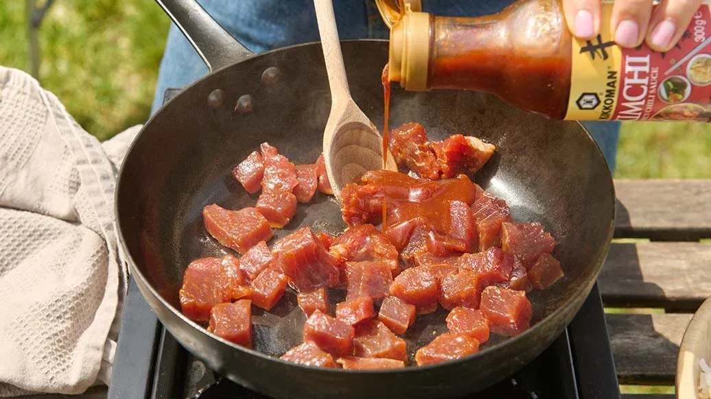 Ton balığını küp şeklinde doğrayın. Kikkoman Spicy Chili Sauce for Kimchi, mirin ve Kikkoman Toasted Sesame Oil'i ekleyip iyice karıştırın. İyice ısınmış tavada kısa bir süreliğine kızartın. Kızarttıktan sonra soğumaya bırakın.