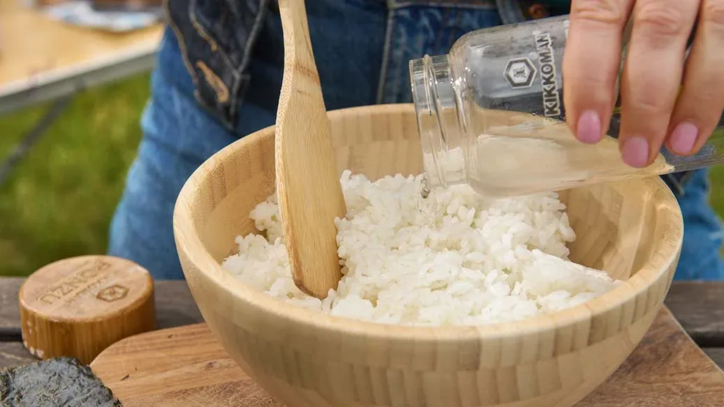 Sushi pirincini soğuk suda en az beş kez yıkayın. Pirinci 1:1.5 oranında su ile kaynatın. Pirinç sirkesi, şeker, tuz ve suyu bir kasede iyice karıştırın. Marinasyonu ılık pirince ekleyip karıştırın.