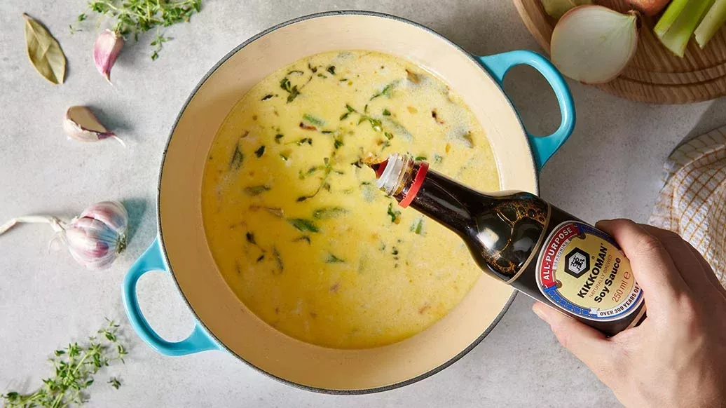 Havuç, patates, kereviz ve soğan gibi sebzelerle bezenmiş kremalı sülünez çorbası. Tabii ki Kikkoman Soya Sosundan gelen derin umami tadı yemeğin tadını çok daha zenginleştiriyor.