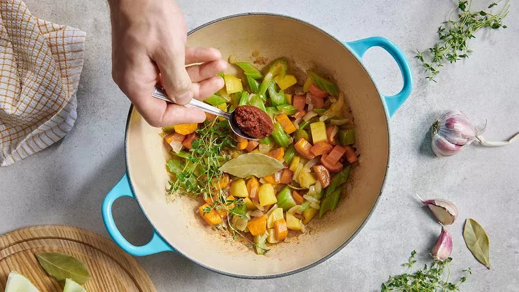 Bütün sebzeleri soyun ve 3-4 mm’lik küpler halinde doğrayın. Kalın tabanlı bir tencerede tereyağını eritin ve sebzeleri içine atın. Orta ateşte yaklaşık 2-3 dakika boyunca sebzeler karamelize olup altın rengini alana kadar soteleyin. Sebzeler pişince üzerine salça, kekik ve defne yaprağını ekleyip 2 dakika daha ara ara karıştırarak pişirin.