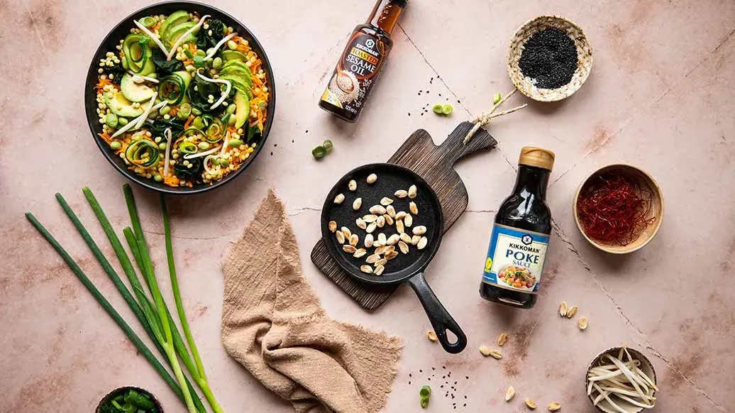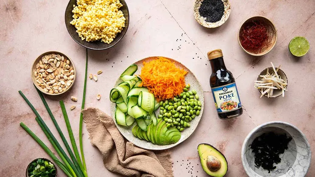 Bu salata; sulu sebzeler, kremamsı avokado, edamame ve leziz wakame yosunu ile hazırlanır. Salataya, Kikkoman Poke Sauce ile yapılan ballı-limonlu hafif bir sos eşlik eder. Yer fıstığı, filiz ve siyah susam, ayrıca bir lezzet ve çıtırlık katar.
