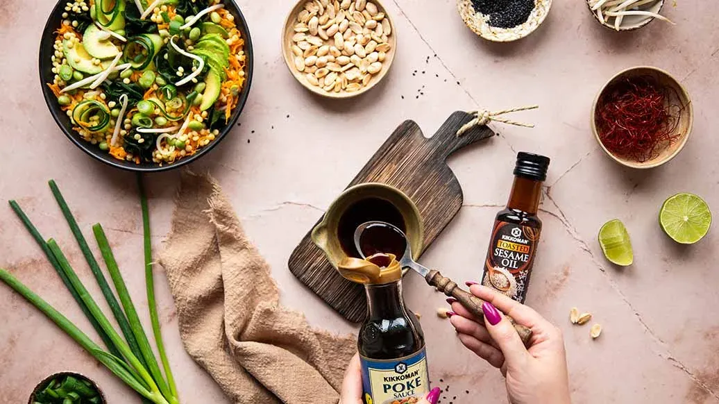 Küçük bir kâsede Kikkoman Poke Sauce, ½ yemek kaşığı limon suyu, Kikkoman Sesame Oil ve balı karıştırın. Sosu salatanın üzerine dökün ve harmanlayın.