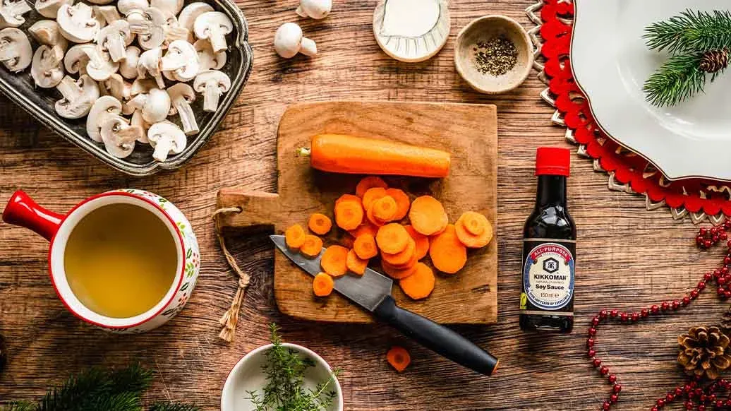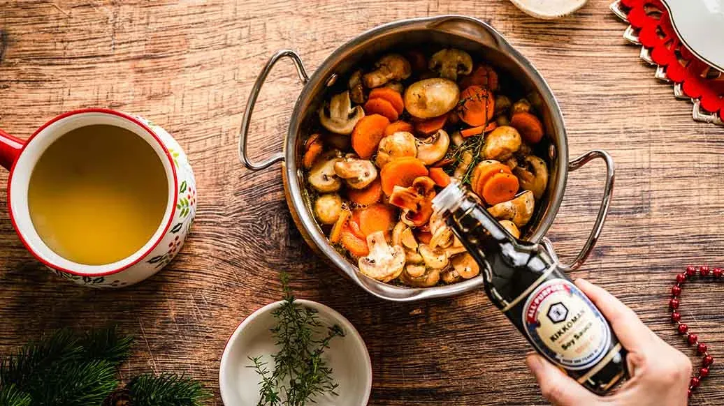 Karşınızda, mantar ve havuçla hazırlanan aromatik bir yahni. Koyu bira ve Kikkoman Soy Sauce ile yavaşça pişirilir. Krema ile tamamlanan bu doyurucu vejetaryen ana yemek, fırınlanmış patatesle birlikte servis edildiğinde özel günlerdeki sofralara çok yakışır.