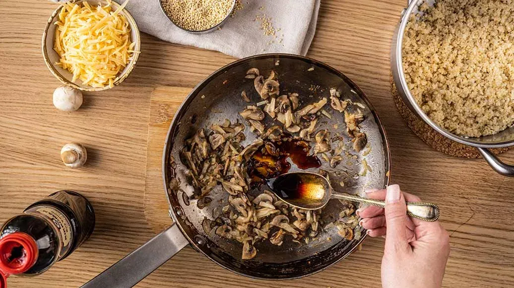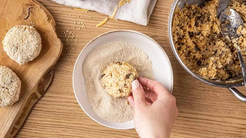 Soğuduktan sonra, mantar ve soğan soteyi darıyla birleştirin. Rendelenmiş peynir, yumurta, Kikkoman Soy Sauce ve unu ekleyin. İyice karıştırın ve köfte haline getirin (örneğin, 6-8 küçük köfte). Hepsini galeta ununa bulatın ve her tarafı 3-4 dakika altın kahverengiye dönene kadar pişirin.