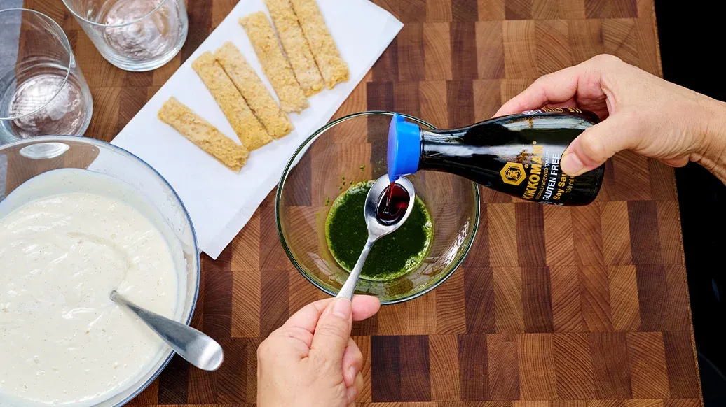 2 tatlı kaşığı matcha – 40 ml sıcak su – 3 tatlı kaşığı Kikkoman Tamari Glutensiz Soya Sosu – 4 tatlı kaşığı agave şurubu (veya akçaağaç şurubu, veya esmer şeker)