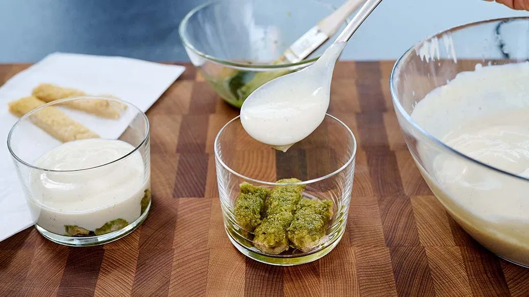 Kremanının yarısını ekleyin ve bu şekilde katlar oluşturun. Tiramisuyu yaklaşık 1 saat buzdolabında soğutun. Servis etmeden önce üzerine matcha serpin ve fıstık, nane ve meyvelerle süsleyin.