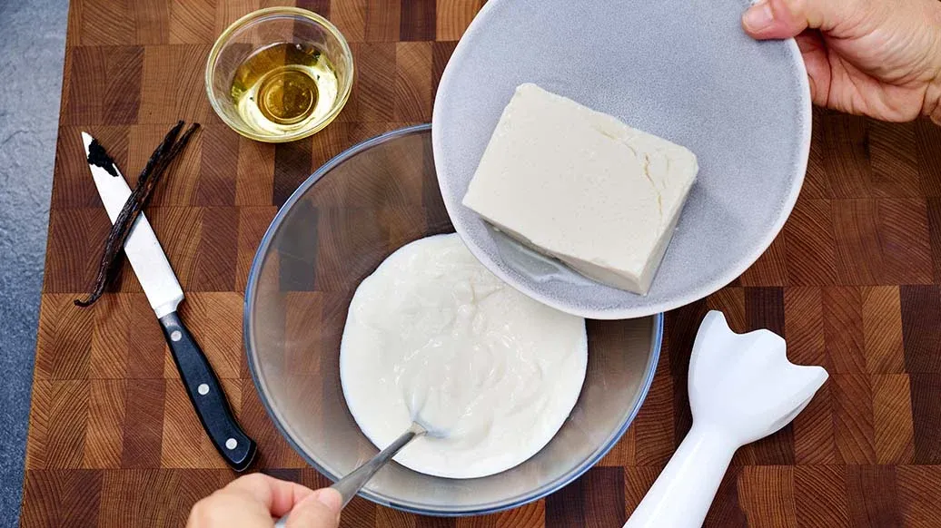 Vanilya çubuğunu boylamasına kesin ve içindeki taneleri bıçakla kazıyın. Tofu, soya yoğurdu, agave şurubu ve vanilyayı blenderda tamamen pürüzsüz olana kadar çekin.