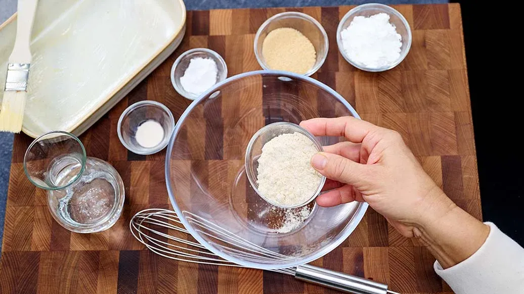½ tatlı kaşığı vegan tereyağı – 45 gr badem unu – 75 gr patates nişastası veya mısır nişastası – 20 gr esmer şeker – 3 tatlı kaşığı kabartma tozu – ½ tatlı kaşığı agar agar – 150 ml maden suyu