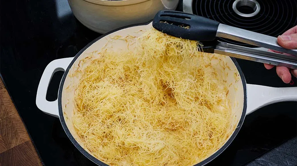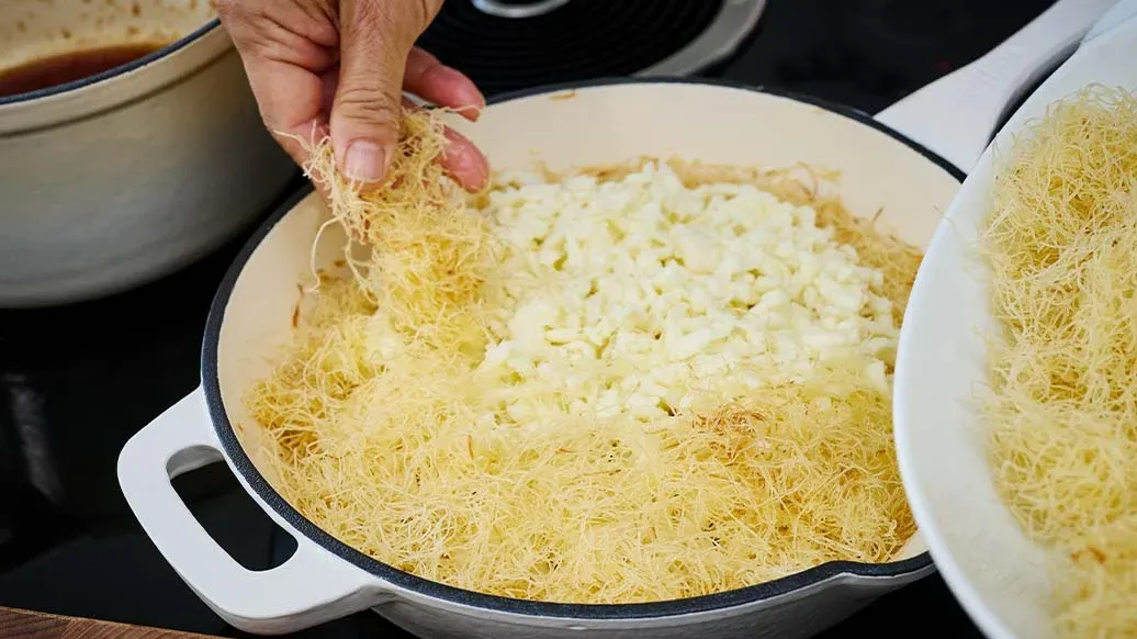 Tereyağını eritip kadayıfla iyice karıştırın. Tüm hamurun yağla kaplandığından emin olun.
