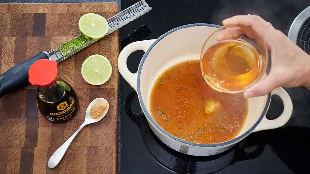 Yeşil lilmonun kabuğunu ince ince rendeleyin, ardından ikiye kesip suyunu sıkın. Kabuğu ve suyunu küçük bir tencereye alın; üzerine balı, Kikkoman Soy Sauce’u, tarçını ve yaklaşık 75 ml suyu ekleyin. 3-5 dakika kadar kısık ateşte kaynatın. Arzu ederseniz gül suyunu ekleyin.